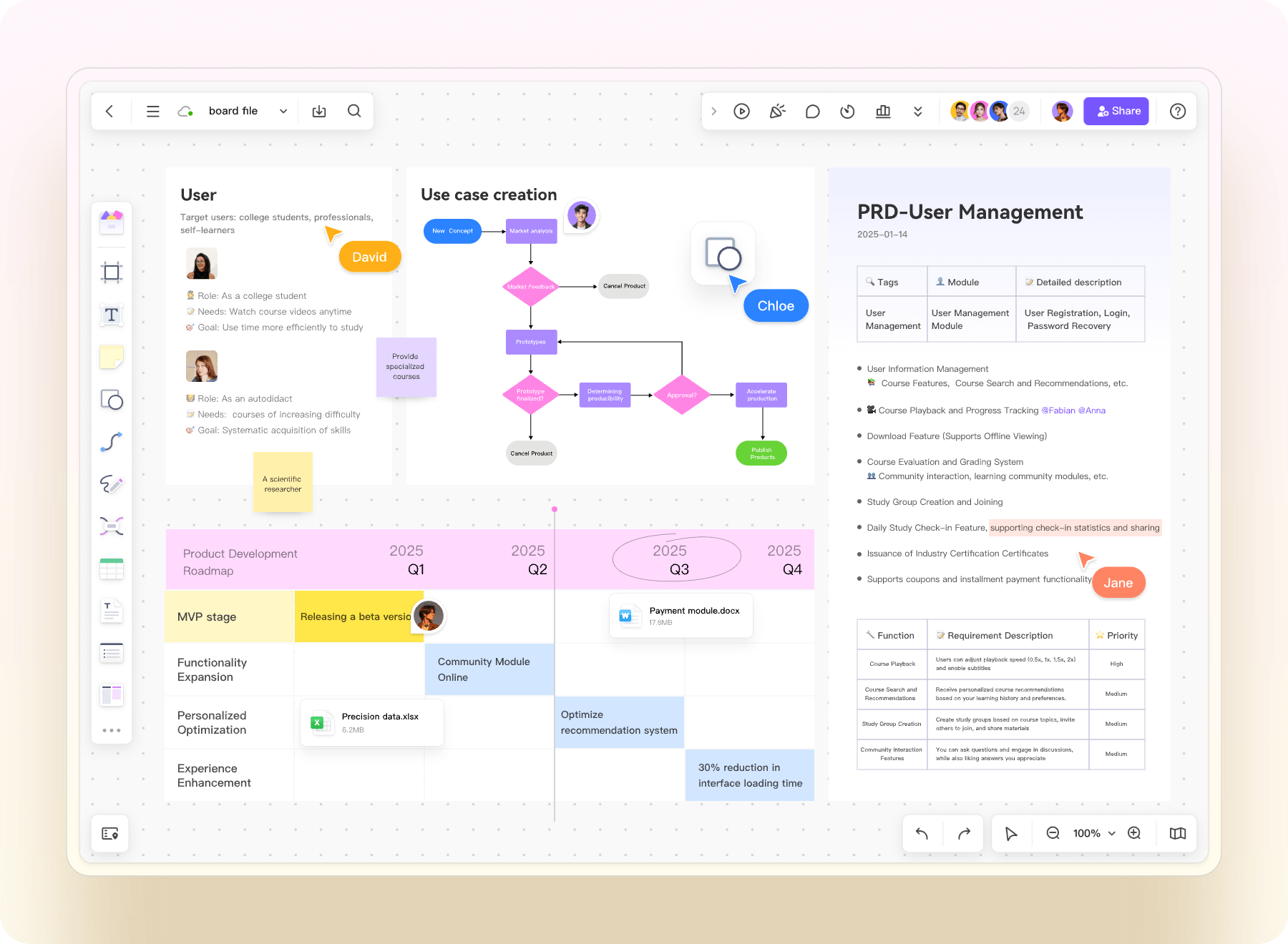 Market analysis, product planning, requirements sorting, task tracking, team